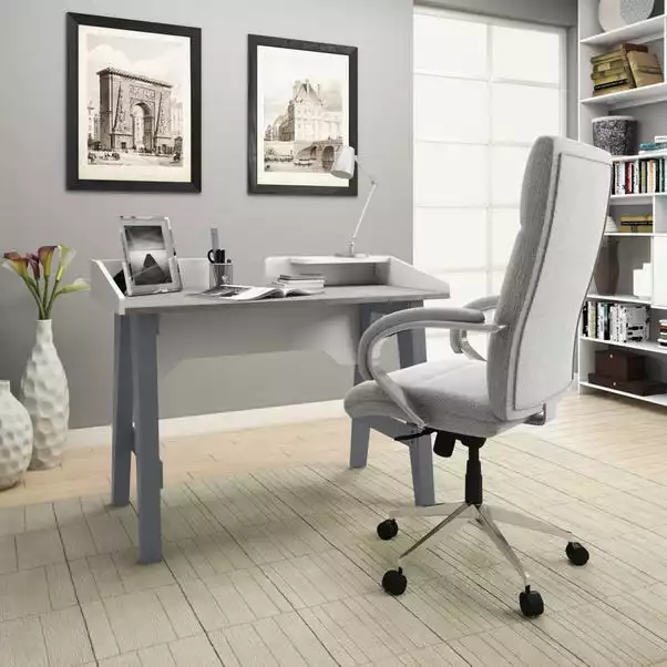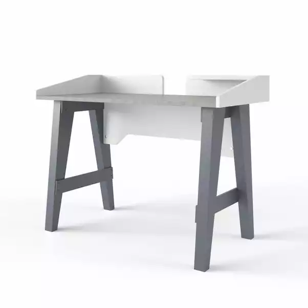 Stylish and sturdy, the modern Truro Desk features a stunning grey faux marble desktop, complemented by the rounded light grey edging. This contemporary desk is supported on sturdy chunky wood legs in an a-frame design, and also features a small raised shelf and a handy cutout in the backboard, perfect for helping with cable management.