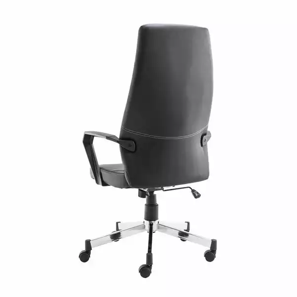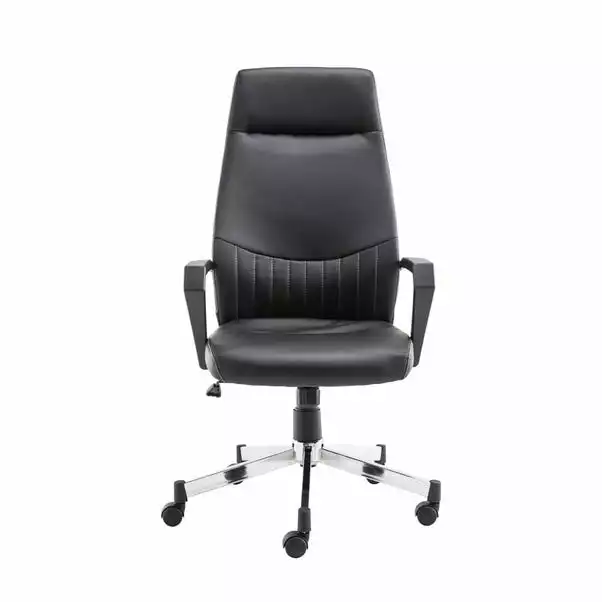 Designed with both style and comfort in mind, the Brooklyn high back office chair features a contemporary design boasting a mix of curved edges and striking angled legs and armrests. The ergonomically shaped back and headrests and foam padded seat are upholstered in a black faux leather with a gorgeous silver stitching detail, offering plenty of comfort and support. Finished off with a modern chrome base and a tilt mechanism with tension control, this self-assembly office chair would make a stunning addition to your home office.