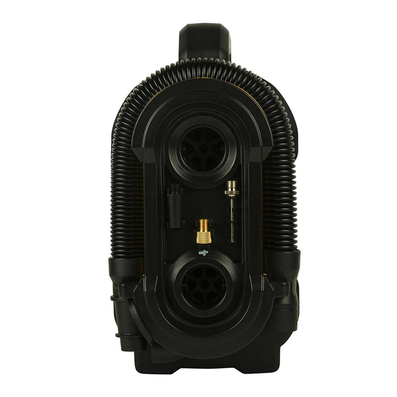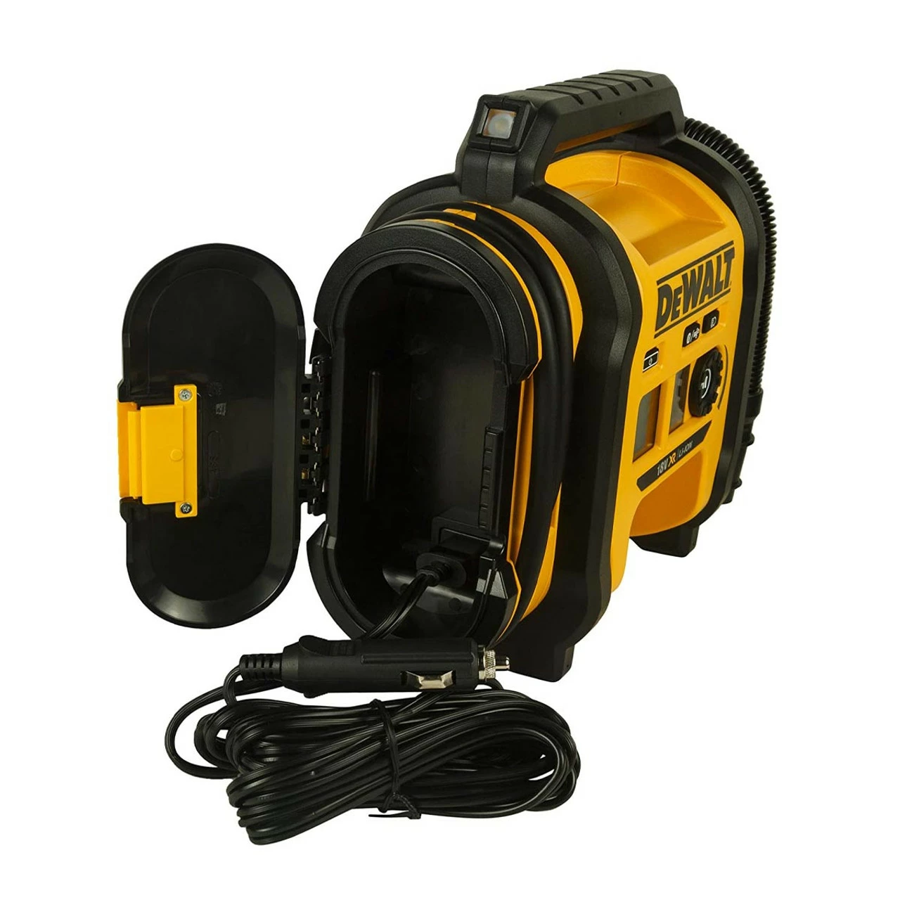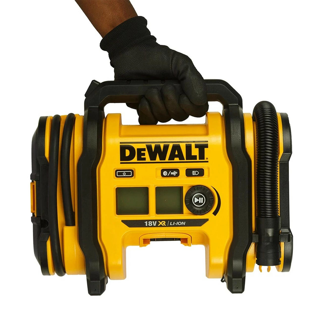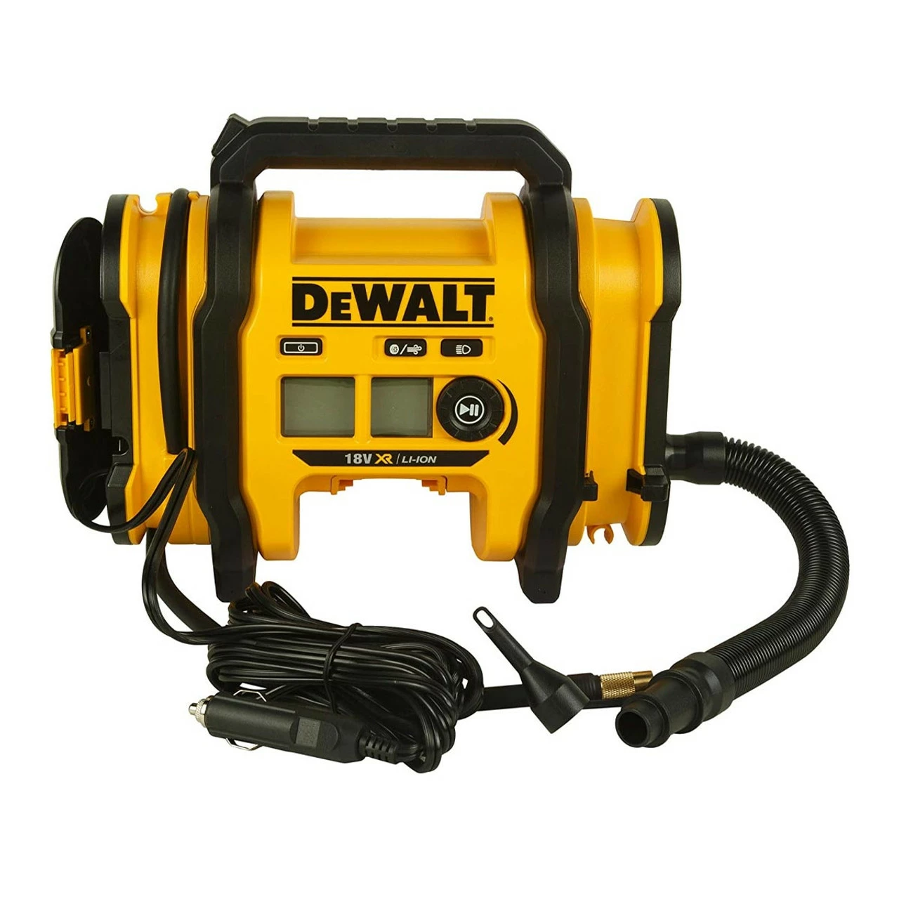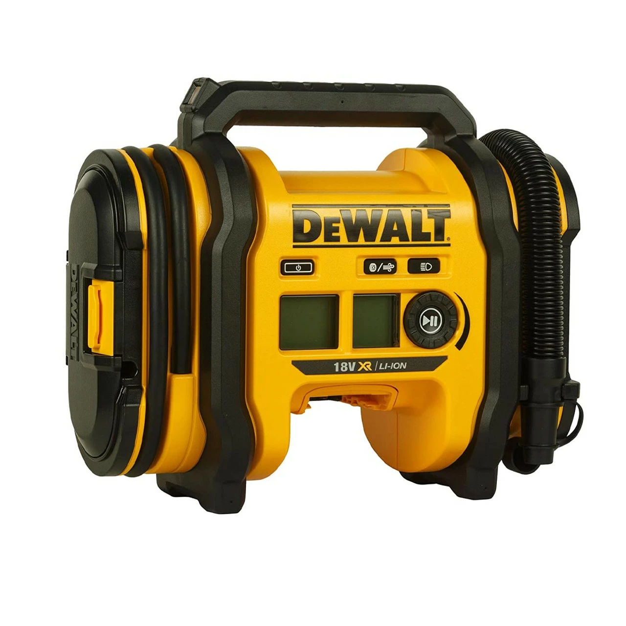 The DeWalt DCC018N XR Triple Source Inflator is a compact and lightweight, high-performance inflator with a durable easy-to-use design. The DeWalt Triple Source Inflator is automatic shut-off feature prevents over inflation. Ideal for tackling big tasks thanks to its high/low pressure output.Â