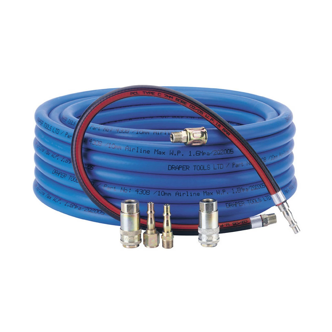 Air tool connection kit consisting of high pressure PVC hose, whip hose, PCL male taper, female parallel and female safety couplings. Sold loose.