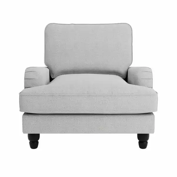 Boasting a modern take on a vintage design, the Beatrice armchair is elegantly crafted from a soft touch boucle fabric, finished in a trendy light grey colourway for a contemporary feel. The seat features a webbed and sprung base, which is coupled with a foam and fibre seat cushion and a fibre filled back cushion to provide optimal support and luxurious comfort. This armchair comes complete with a stylish pleated arm design, piped edge detailing and turned, black painted rubberwood legs making it a welcome addition to any home.