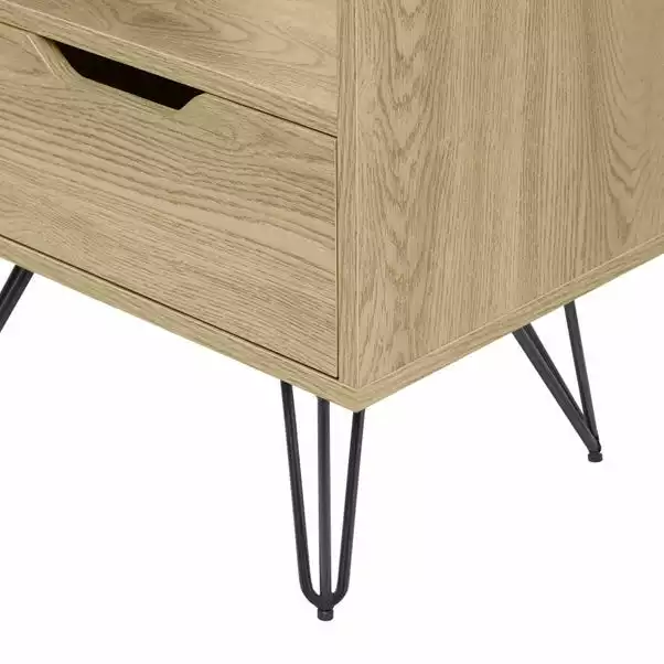 This Bella 1 Drawer Bedside Oak Effect is a great place to store your bits and bobs. The oak effect finish and black metal hairpin legs add a classic look that will complement any room in the house.