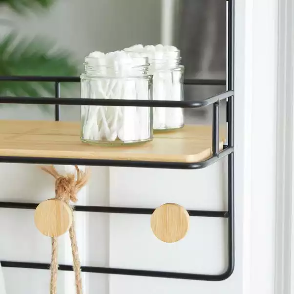 Boasting a fashionable black wire design, this over the door mirror is the perfect option for saving space in your bathroom. Use the mirror for multiple purposes with the shelf and 4 hooks, helping you keep your bathroom accessories tidy. The mirror is made to last as it is crafted from durable iron and bamboo.