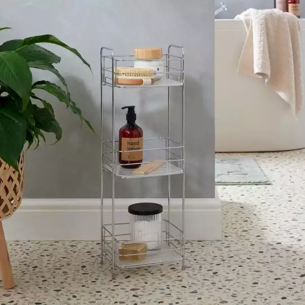Designed to be freestanding, this chrome bathroom caddy features three spacious shelves great for storing your toiletries and bathroom products in an easy to reach place.
