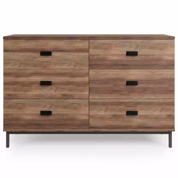 Round out your master suite with extra storage space and style with our Fulton 6 Drawer Chest. Featuring a stylish pine effect finish and black metal handles and legs, this industrial-inspired unit is completed with six drawers on metal runners with drawer support, these drawers are able to hold onto a little extra weight when needed, perfect for stashing away your winter boots.