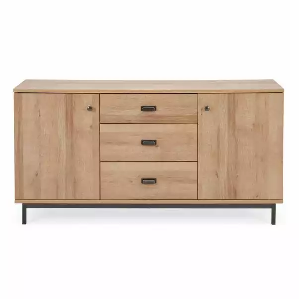 Crafted with three ample-sized drawers that glide on smooth metal extension runners with pull-out stop, this large sideboard features two spacious cupboards complete with fixed shelves inside for added convenience.