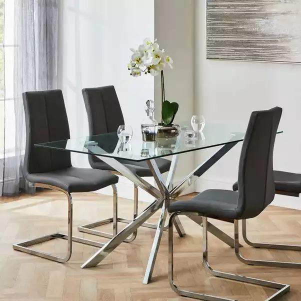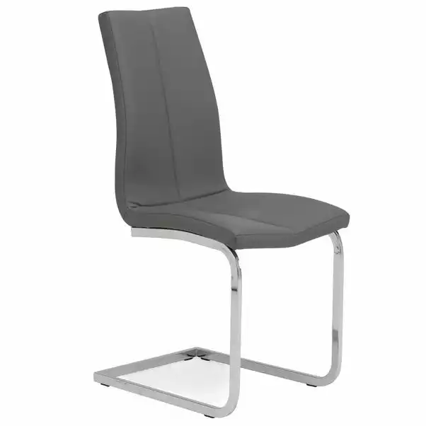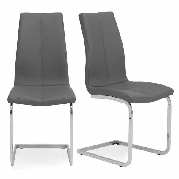 Offering a modern luxe style, the Jamison set of 2 dining chairs are upholstered in an easy-clean grey faux leather making then perfect for those with busy households who don’t want to compromise on style. These easily assembled chairs feature high shine chrome cantilever frames complete with comfortable foam-filled seats and backrests.