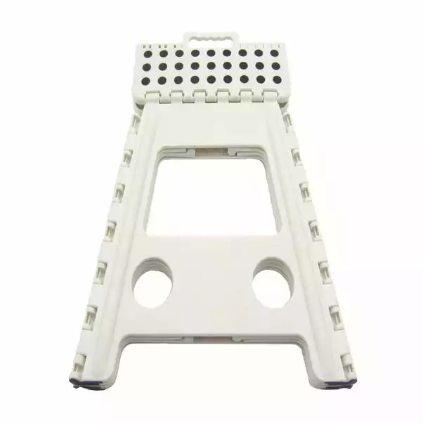 This easily stored foldup step stool is finished in white and made from durable plastic.