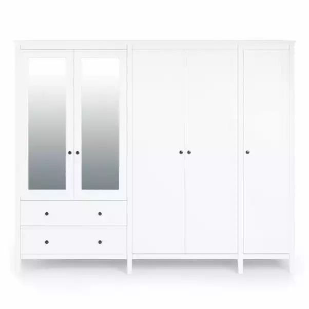The Lynton 5 Door Wardrobe is the perfect storage solution for larger bedrooms or those requiring a lot of storage space. This wardrobe has 3 hanging rails within spacious cabinet space as well as 2 large drawers, providing more than enough space to store dresses, suits, folded clothes, accessories, shoes, and other items. This Lynton wardrobe has 2 mirrored fronts and has a timeless painted finish to look stylish for years to come.