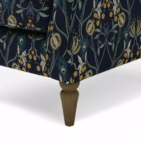 Featuring the timeless Oswald armchair, offering a comfortable sit thanks to its sumptuous foam and fibre filled cushions and supportive pocket sprung seat. Upholstered in a Navy Havisham Print with a smooth polycotton fabric, this stunning armchair boasts a classic wingback design, complete with scrolled arms, piped edge detailing and sturdy, oak finished wooden legs. Matching Oswald Navy Havisham Print Footstool With Storage available. The Oswald armchair is also available in a range of different colours, fabrics and sizes and offers easy assembly, simply attach the feet and enjoy luxurious relaxation.