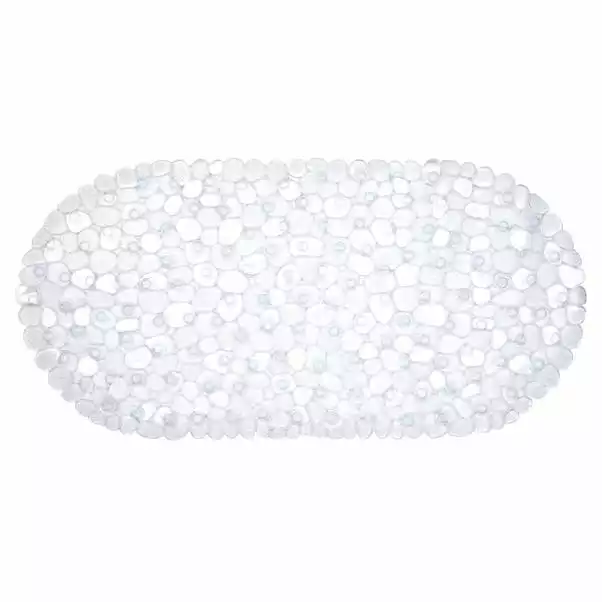 Made from durable material with anti-slip suction cups, this bathmat is designed with a pebble-style pattern and is available in clear.