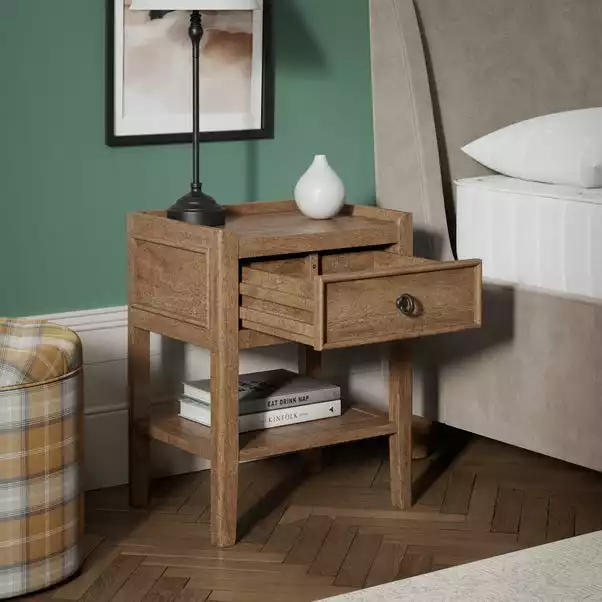 Capture the charm of old-world style with this bedside table. Made from mango wood, featuring a rich black cast metal handle and a spacious drawer, this piece will add elegance to your bedroom.