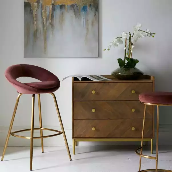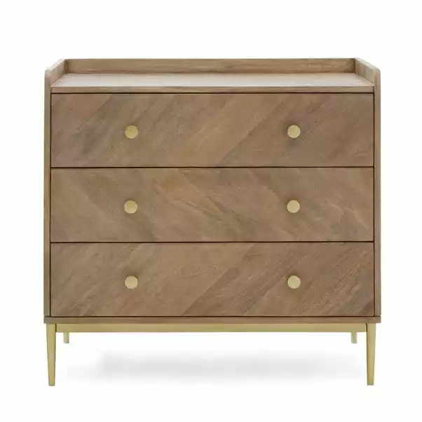 Simple yet ultra-stylish, the Rumi range is made from of solid mango wood and a beautiful diagonal grain effect design with a natural finish. Styled with an elegance brass coloured handles and legs, this range is supplied partly-assembled with smooth running drawers for easy use.