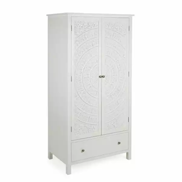 The Samira White Double Wardrobe is a stunning piece to include in any bedroom. Featuring a delicately detailed, carved out wooden front, this wardrobe provides both style and practicality without compromising on either. This carved design is brought out with the stylish paint finish, which complements the beautifully finished brushed metal handles. Finished in a timeless white colourway, the Samira Double Wardrobe features a ample room to hang up your clothes and a drawer for extra storage space.