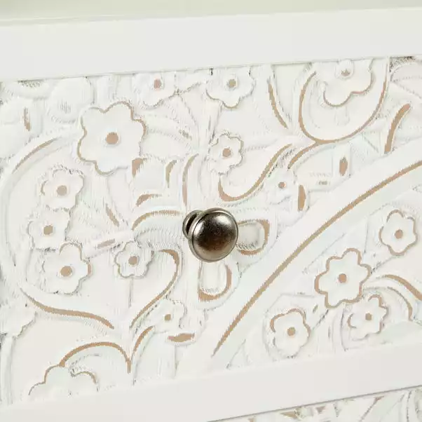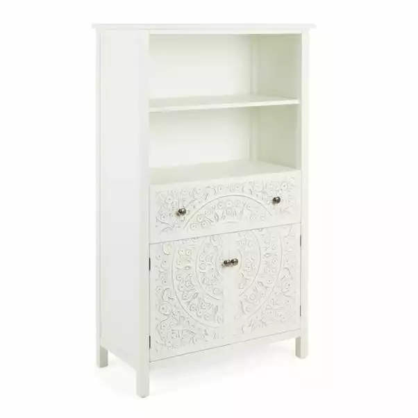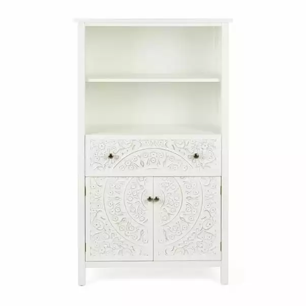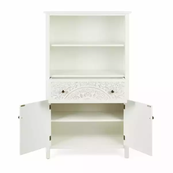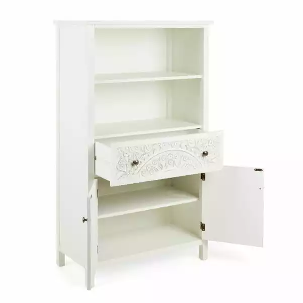 This elegantly designed Samira White Tall Cabinet features a delicately detailed, carved out pattern front. This wooden carved design is brought out with the stylish paint finish, which complements the beautifully finished brushed metal handles. Finished in a timeless white colourway, the Samira Tall Cabinet features a spacious cupboard with fixed shelves and a drawer, providing an ample amount of storage space.