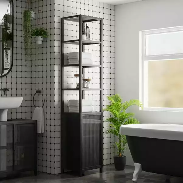 If you’re low on space but in need of storage, the Stannis tall cabinet may just be the thing you need. Exuding a stylish industrial vibe, this unit is constructed with a sleek, black metal frame and features a reeded glass front cabinet. This cabinet is perfect for having your bathroom essentials within reach for everyday use or guests, while still having the option to hide clutter or medication behind the cabinet doors.