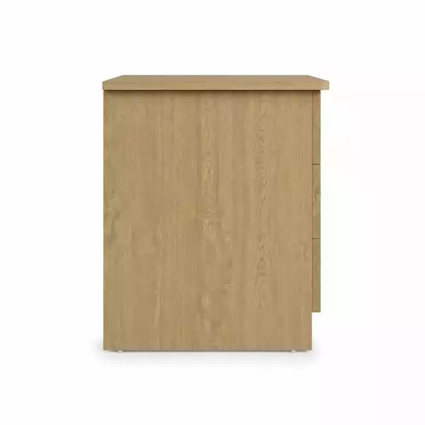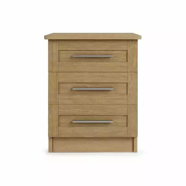 This Toby 3 Drawer Bedside features 3 spacious drawers, perfect for all your bedside storage needs. Featuring classic yet contemporary shaker style details and finished with a wood effect and sleek matte silver metal handles, this bedside is sure to be a hit in any home.