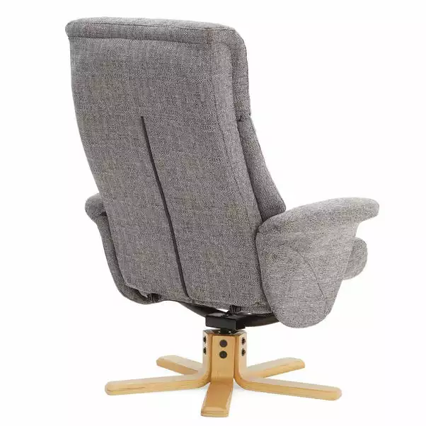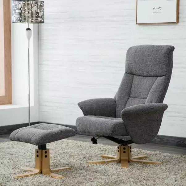 Beautifully crafted, this self-assembly swivel chair is upholstered in a soft polyester fabric and features a padded headrest and deep set padded back to provide utmost comfort. Designed in a grey colourway with wooden legs, this recliner chair is supplied with a matching footstool.