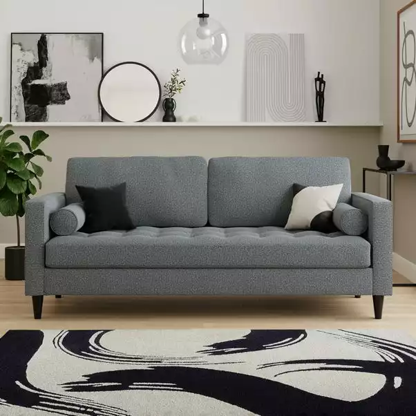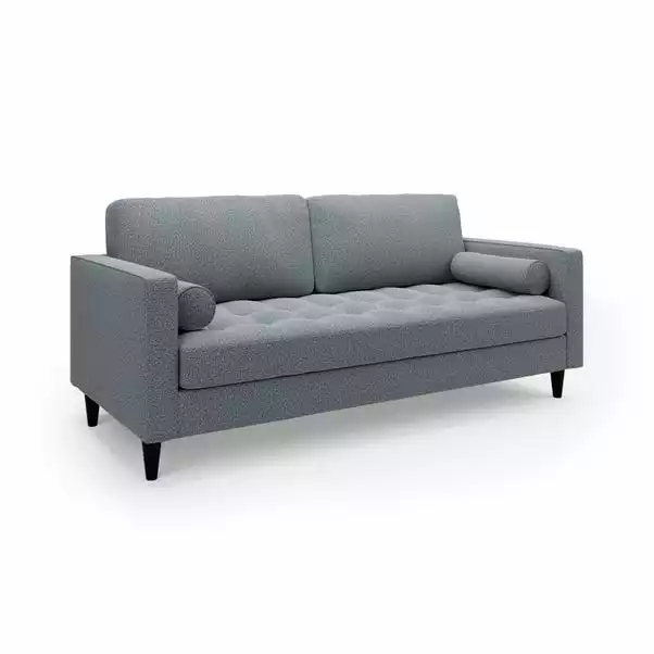 Bring some modern retro styling to your living room with the stylish Zoe 3 Seater Sofa. Finished in a trendy light grey colour, this sofa features soft and durable boucle fabric upholstery, styled with a gorgeous tufted seat cushion, piped edge detailing and stylish tapered solid wood legs. As stylish as it is comfortable, the Zoe is the perfect place to sit back and unwind, featuring a foam filled, sprung seat and fibre filled back cushions, as well as two matching bolster cushions. This sofa has non-reversible back cushions and a fixed seat cushion.