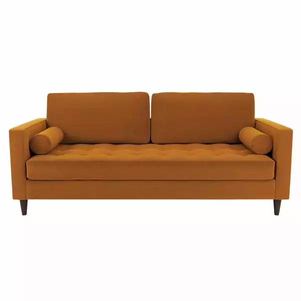Bring some modern retro styling to your living room with the stylish Zoe 3 Seater Sofa. Available in a choice of bright and trendy colours, this sofa features soft touch velvet upholstery, styled with a gorgeous tufted seat cushion, piped edge detailing and stylish tapered solid wood legs. As stylish as it is comfortable, the Zoe is the perfect place to sit back and unwind, featuring a foam filled, sprung seat and fibre filled back cushions, as well as two matching bolster cushions to boot. Made with recycled materials. This sofa has non-reversible back cushions and a fixed seat cushion.