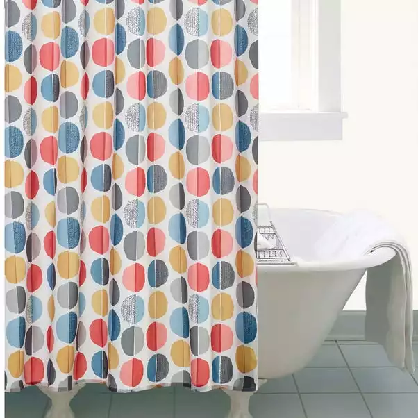 Designed with a bright circle pattern this colourful shower curtain will liven up any bathroom. Complete with chrome colour brass eyelets and a weighted hem, this machine washable shower curtain is made from durable, water repellent fabric and finished with a lustre coating for a soft feel.