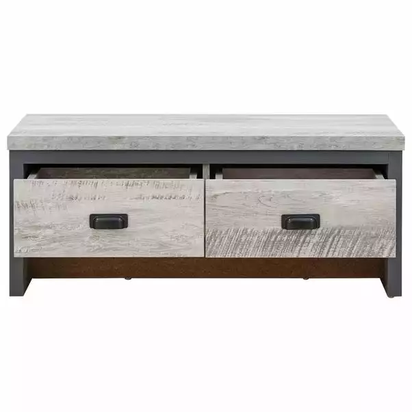 Give your interior a touch of urban chic with the Boston coffee table. The sturdy construction is finished in a durable industrial grey effect with chunky 30mm top and deep wooden frame in contrasting grey tones providing an authentic look and feel. The two deep drawers have a matching wood-effect finish inside and are ideal for magazines, books and Media devices. The matching faux drawer fronts on the opposite side create a pleasingly symmetrical design without sacrificing storage depth