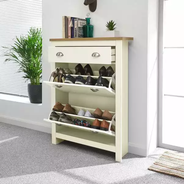 The perfect mix of practicality and style, this Lancaster Cream Shoe Drop is complete with two shoe rack spaces and is perfect for neatly storing away footwear. Available in either a white or grey colourway, and featuring a contrasting oak effect top, this product is as stylish as it is practical.