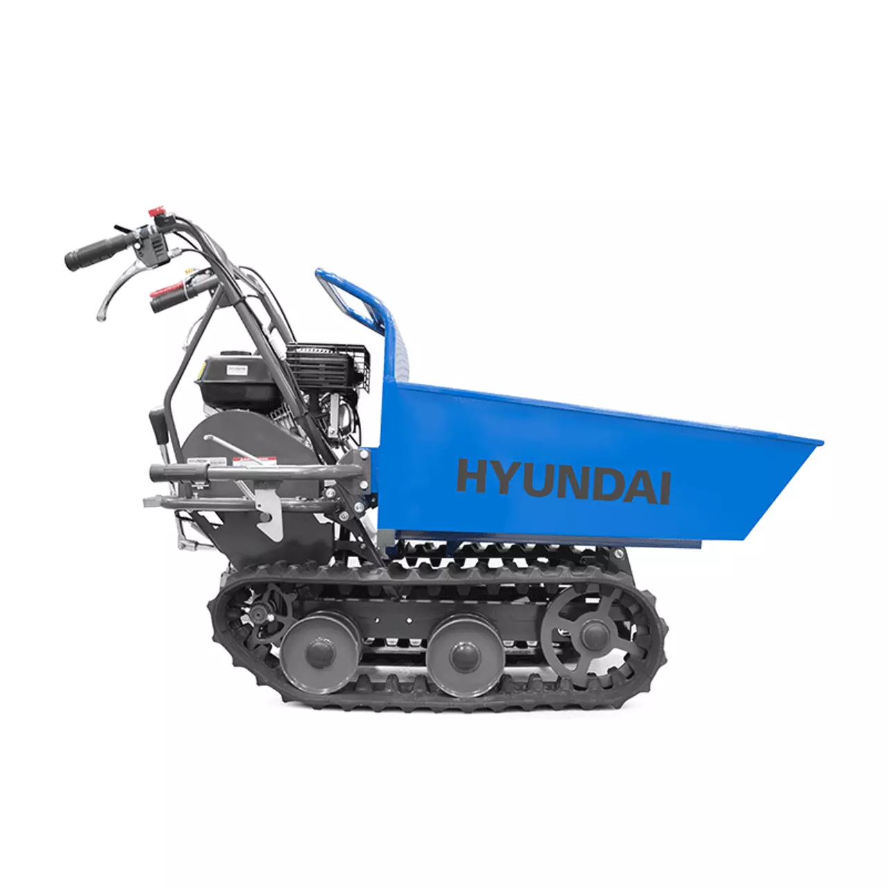 The Hyundai HYTD300 is a 196cc petrol heavy duty mini transporter with tracked drive system from Hyundai. The dumper is suitable for a wide range of loading and transporting applications including construction and worksites, agricultural, landscaping, garden and allotment use and can accommodate all kinds of loads on various terrains. There is also the skid steer system which allows you to spin nearly on the spot with no need for lifting or dragging.