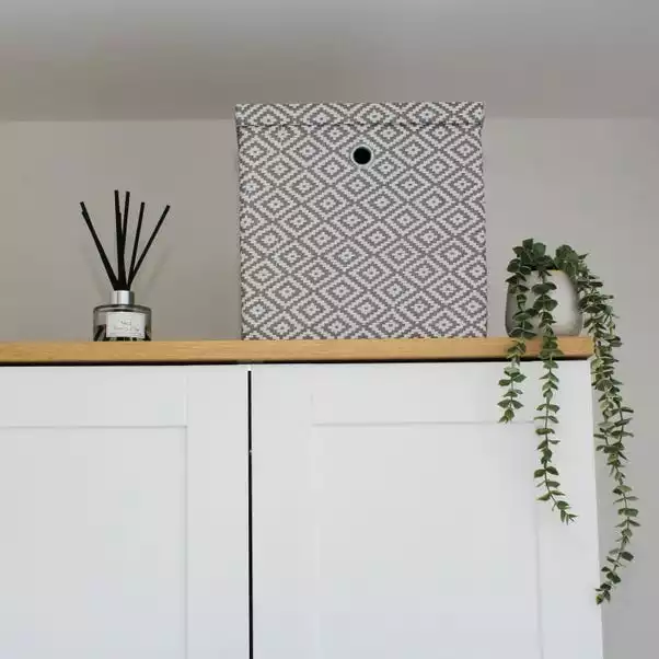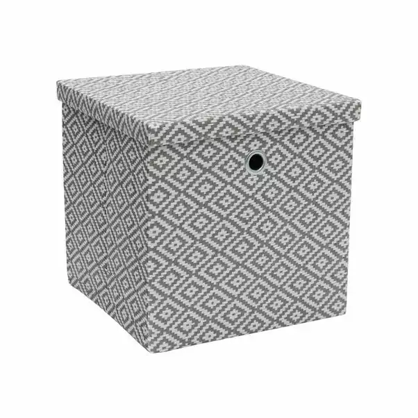Upgrade your storage game with the Argyle foldable storage box from JVL – a stylish and functional addition to any room in your home. This square box features a trendy diamond pattern in a soft grey colour, designed to complement most contemporary interior styles and can be easily folded away when not in use, saving space in your home. The lid keeps your items enclosed and helps to clear clutter and organize your space with style. The paper construction of this storage box makes it a great option for storing items such as office supplies, stationary, toys and more and the metal handles add a touch of elegance.