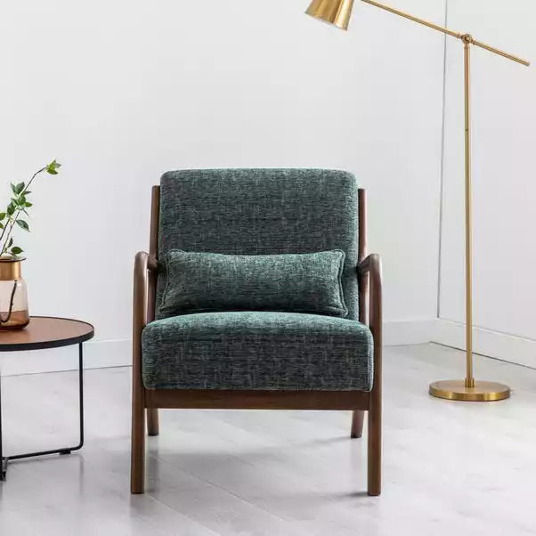If you’re looking for a stylish, retro-inspired armchair with a unique and comfortable design, look no further. This chair features a chenille upholstered seat with matching bolster cushion, accented by the wooden frame and curved arms that make it an ideal piece in your living room or bedroom.