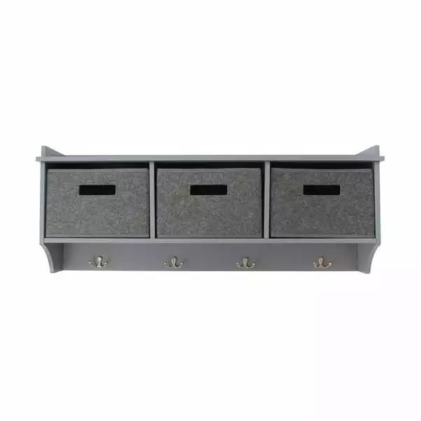 A perfect finishing touch to any room or hallway within your home, this wall storage unit has been designed from MDF and finished in a modern grey colourway. Featuring three practical felt baskets for efficient neat storage, this storage unit comes complete with four double coat hooks, three medium felt baskets and a top shelf for further storage. Made with pre drilled fixing holes for added convenience, this storage unit is supplied with a one year guarantee.