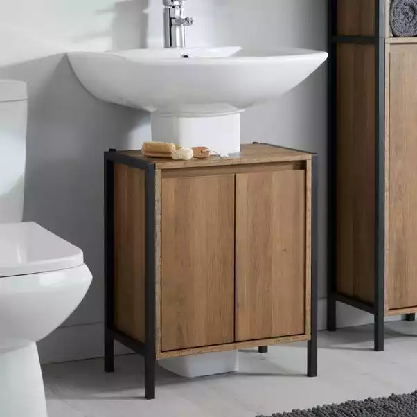 Boasting an oak effect and black metal frame this under sink unit gives your bathroom a ultra modern finish whilst also providing your bathroom with ample storage space. This unit includes 2 internal shelves that are ideal for organising all your bathroom toiletries. With a sleek handle-free design this under sink unit fits snuggly under most standard sinks.