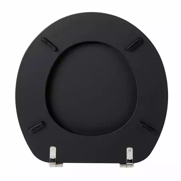 Crafted from discarded wood shavings and fibres, this black toilet seat is perfect for any bathroom style. The stainless steel hinges are rust proof and the toilet seat has been with a soft touch rubber coating. Part assembly is required and can be wiped clean.