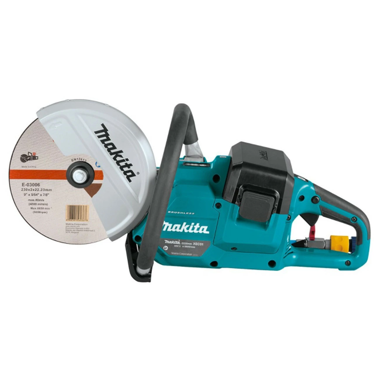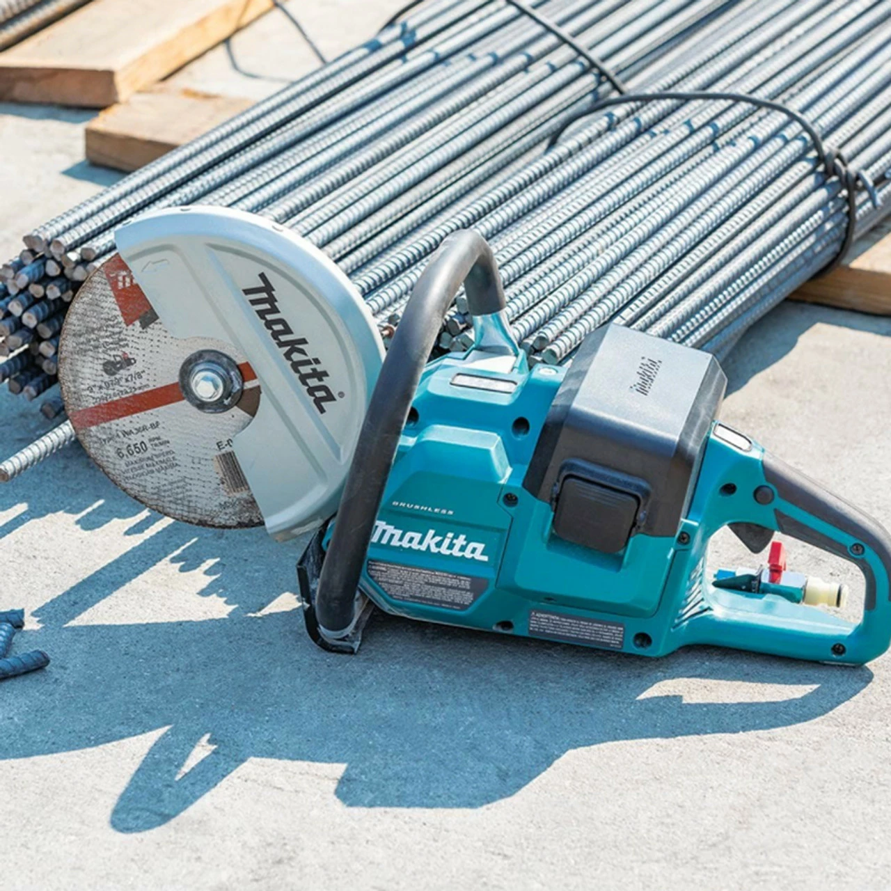 This Makita DCE090ZX1 Brushless Cut Off Saw features a powerful brushless motor, and requires two 18v LXT Li-Ion batteries. There’s plenty of safety features, including an electric brake, soft start, battery cover to protect the battery during wet cutting, a lock-off button, and Active Feedback Sensing Technology which shuts down the current to the motor if the rotation speed suddenly slows down.