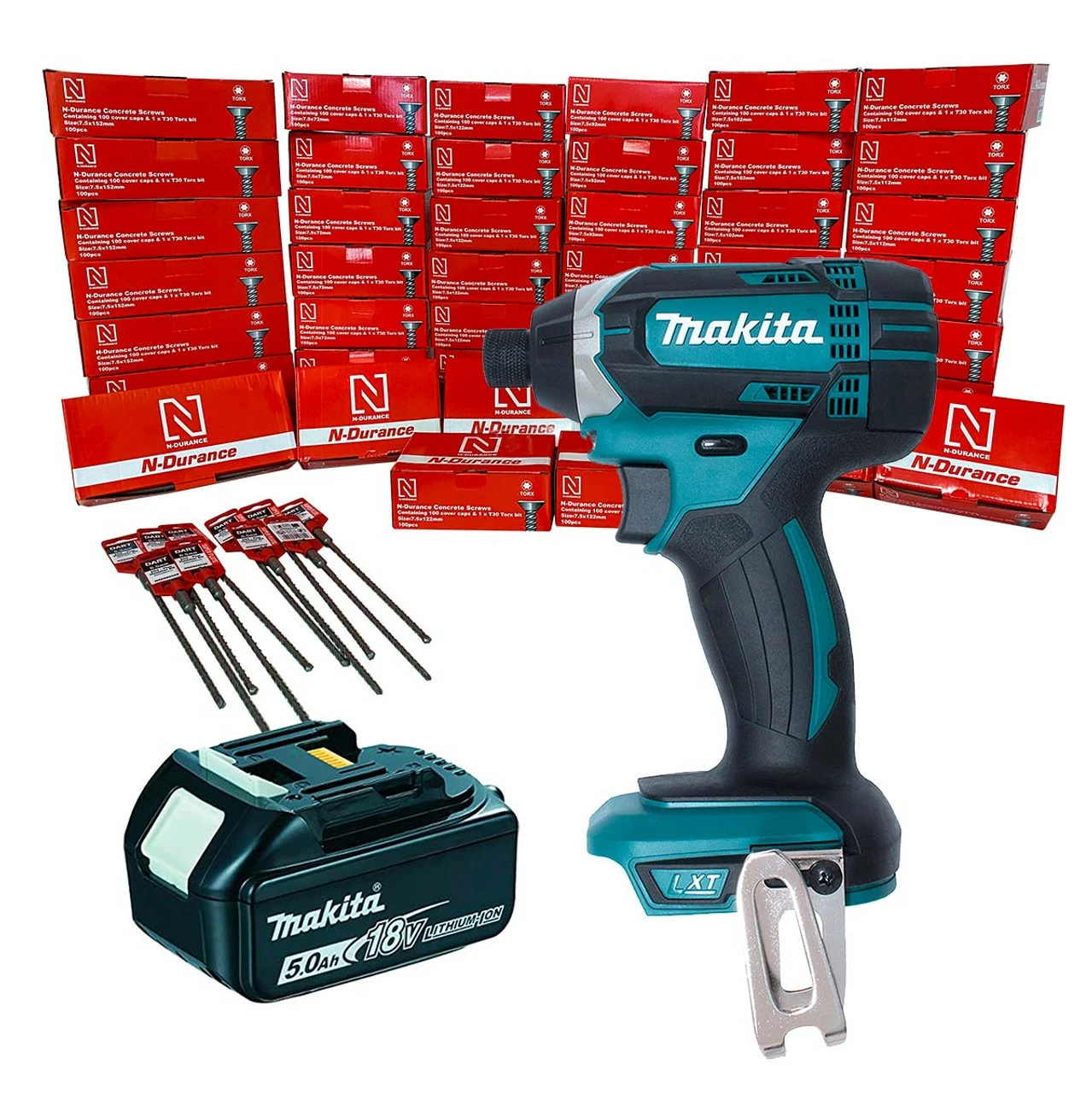 Makita DTD152Z 18V Impact Driver with 1x 5.0Ah Battery & Concrete Frame Screw Pack, 72 – 152mm (5000 Mixed Pack)