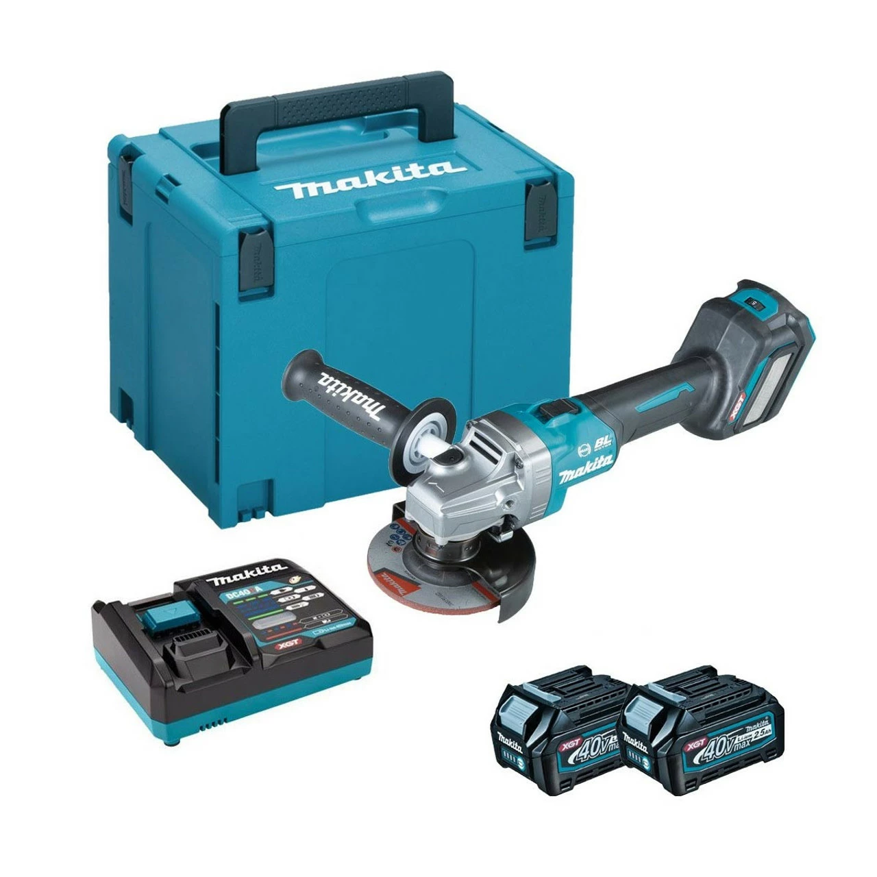 The GA022GD201 is supplied with 2x 2.5Ah 40V batteries, a DC40RA fast battery charger, a Makpac Type 4 connector case, a side handle, a grinding wheel, and a lock nut wrench.