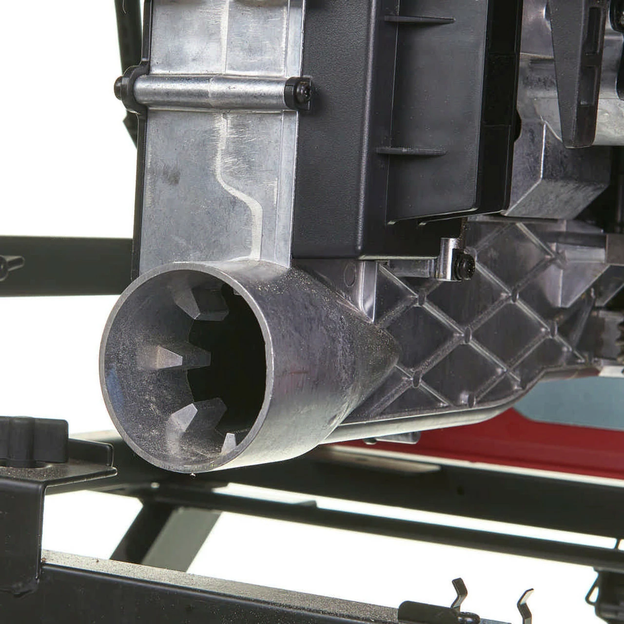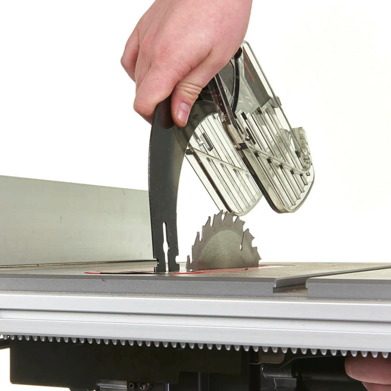 - Quick change guard and riving knife allows the user to remove and adjust the riving knife and guard without the need to remove the throat plate.