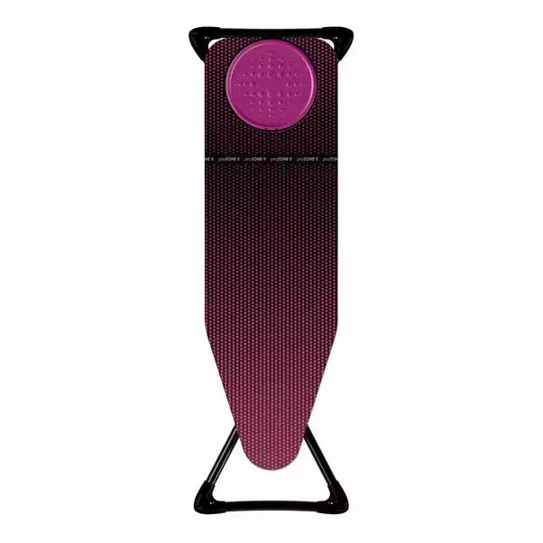 Featuring solid loop legs, this Minky black ironing board includes a pink bespoke pro zone cover with metallised dots to reflect the heat to help provide a crease free finish and a movable silicone rest for your iron.