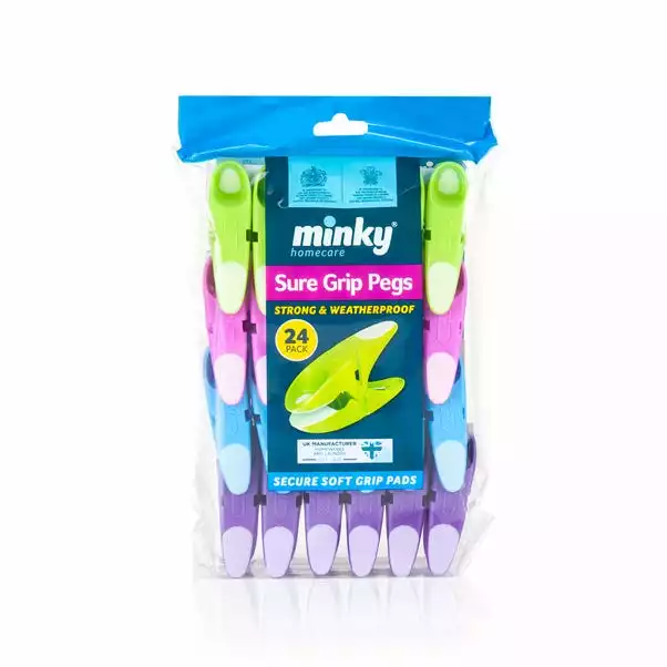 Constructed from hardwearing plastic with soft grip pads, these Minky sure grip pegs are rust resistant and come in a pack of 24.