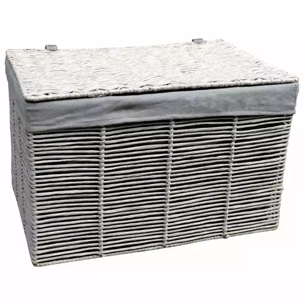 Featuring a grey lining and painted grey finish, this woven paper rope trunk with closable lid is available in a choice of sizes.