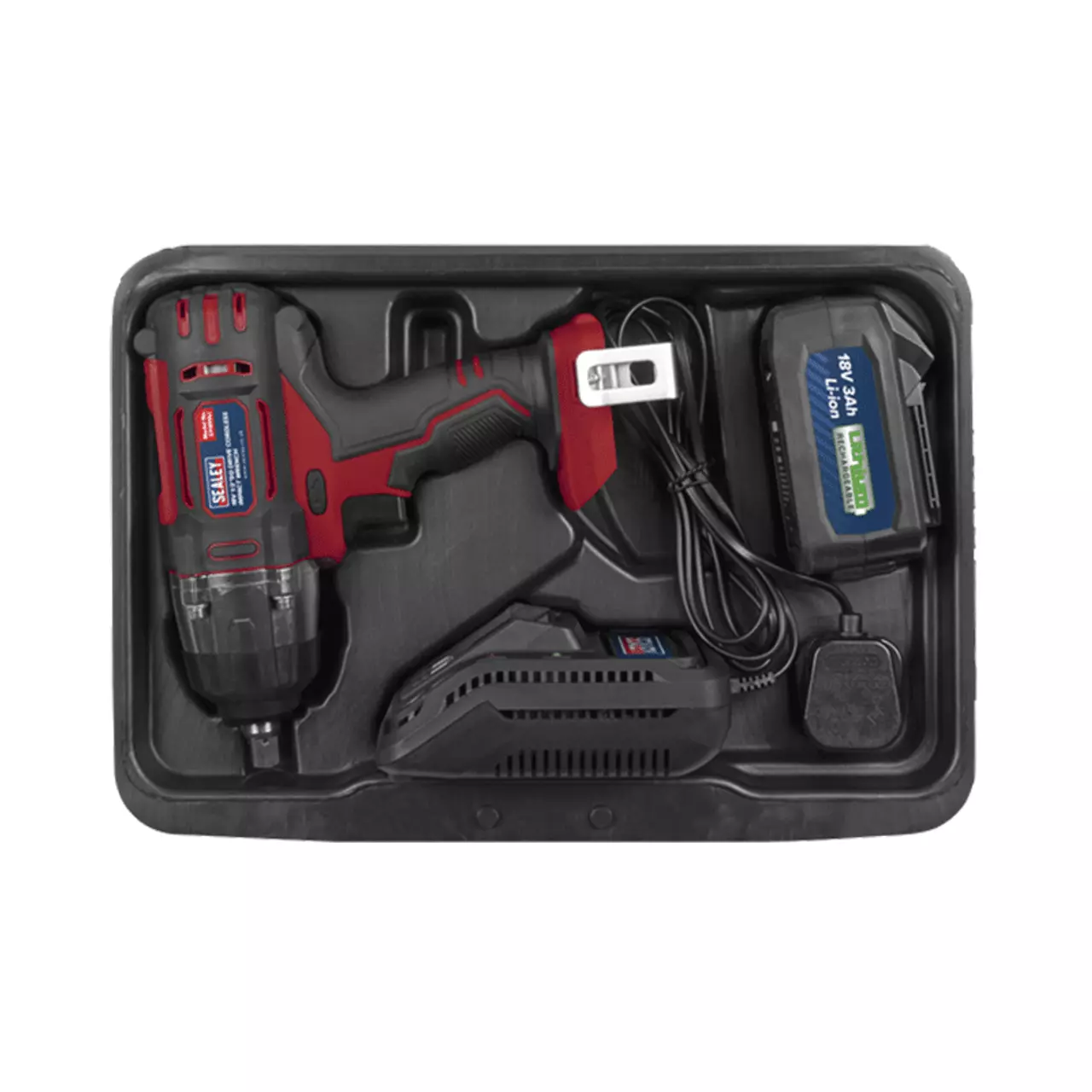 The Sealey CP400LI 18V 1/2″Sq Drive Cordless Impact Wrench has a variable speed trigger and also has a double injected body with rubber grips for added comfort and control whilst working. This impact wrench as has a cast aluminium gearbox and produces up to 400Nm of torque. The impact wrench is supplied in a storage case with a 3Ah Lithium-ion battery and 80 minute mains charger.