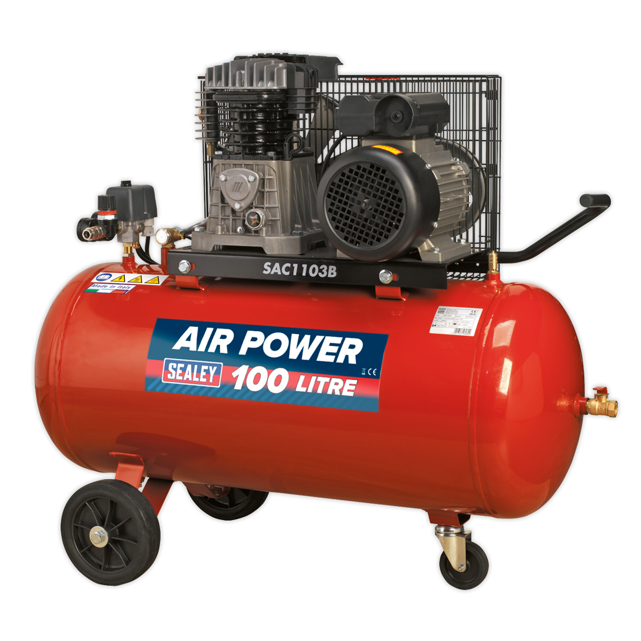 Sealey SAC1103B Compressor 100L Belt Drive 3hp with Cast Cylinders & Wheels