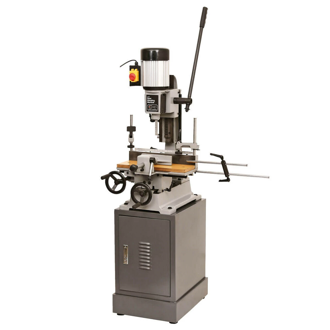 The SIP Bench Morticer with Cabinet features an integrated cabinet with a solid cast iron work clamp and work table, which has vertical and sideways stops, and rise and fall handle.